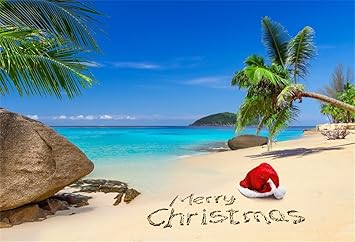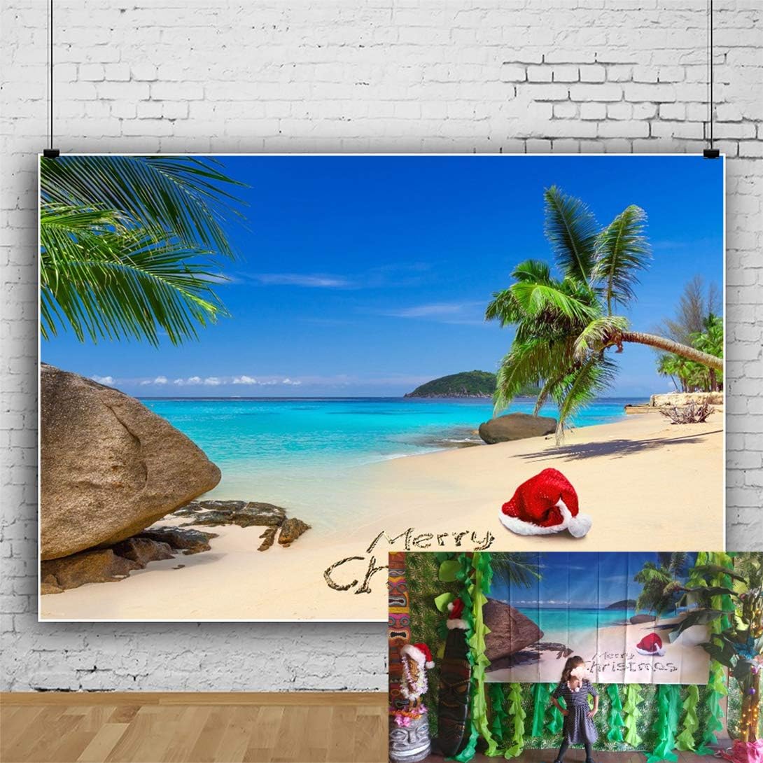 Ofila Tropical Beach Christmas Backdrop 7x5ft Seaside Christmas Holidays Celebration Santa Hat Palm Trees Decoration Chrismtas Photo Booth Merry